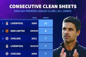 英超球队最长零封榜:阿森纳当前6场列第10 ,05年利物浦11场居首