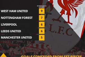 大难题!本赛季,英超中仅森林和西汉姆联比利物浦定位球丢球更多