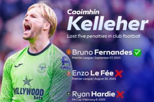 【扑点高手】Opta:凯莱赫效力于利物浦和布伦特福德期间,共面对7次点球(不包括点球大战),其中扑出4次(57 %)。