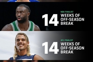 报告指出,一名顶级足球运动员的休赛期仅为3周,而相比之下,进入NBA总决赛的篮球运动员、AFL决赛的澳式橄榄球运动员以及MLB决赛的棒球运动员,其休赛期分别长达14周、14周和15周。