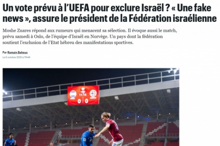 体育资讯10月07日讯 北京时间10月12日星期日,世预赛欧洲区小组赛I组第7轮,挪威坐镇主场迎战以色列。在这场比赛之前,针对有计划在欧足联进行投票以排除以色列的报道,法国媒体巴黎人报表示,以色列足协主席做出了回应称这是假新闻。