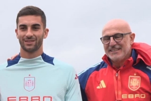 费兰-托雷斯达成为西班牙队出战50场比赛里程碑,西班牙队昨日训练之前向他颁发了50场纪念球衣,全队与费兰合影表示祝贺。