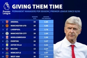 体育资讯10月22日讯 《转会市场》统计了英超各队的历任主教练平均执教年限情况,阿森纳无悬念居首。