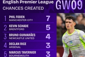 英超第9轮创造机会榜:福登7次居首,沙德5次第二,吉马良斯4次
