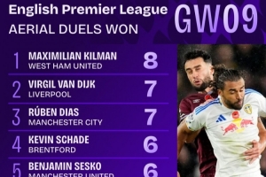 英超第9轮赢得空中对抗次数榜:基尔曼8次最多,范戴克等两人7次